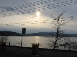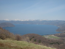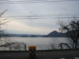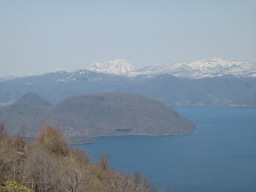 | 朝の洞爺湖、山岳にはまだ雪が舞う | |